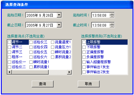 (3)報(bào)警:變頻器、溫度、濕度、風(fēng)壓發(fā)生異常報(bào)警時(shí),相應(yīng)的顯示會(huì)發(fā)生閃爍及聲音報(bào)警點(diǎn)擊消除;同時(shí)選擇各類報(bào)警并記錄報(bào)表;提供打印功能。