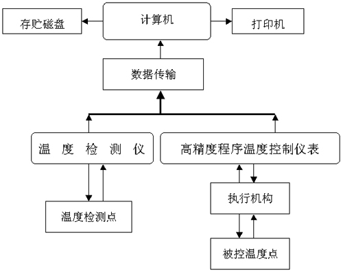 為達到上述生產(chǎn)工藝要求,系統(tǒng)采用各控制點分別采用單點高精度控制器進行單獨控制,各參數(shù)點分別采用單獨的數(shù)據(jù)采集設(shè)備進行單獨采集,將所有數(shù)據(jù)傳送至中心計算機進行集中顯示、分析和處理。系統(tǒng)結(jié)構(gòu)如圖所示: