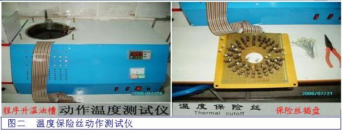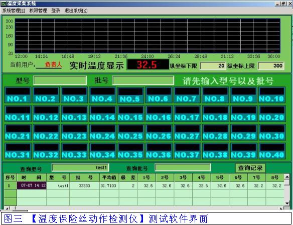 在加熱油鍋內(nèi)放置40個(gè)溫度開(kāi)關(guān),鍋內(nèi)的溫度從50℃向300℃不斷升溫1℃/分鐘,當(dāng)溫度開(kāi)關(guān)斷開(kāi)時(shí)記錄每個(gè)斷點(diǎn)的溫度。在軟件輸入產(chǎn)品型號(hào)、批號(hào)可查詢記錄,程序控溫結(jié)束及時(shí)計(jì)算區(qū)分出產(chǎn)品的合格與不合格品。
