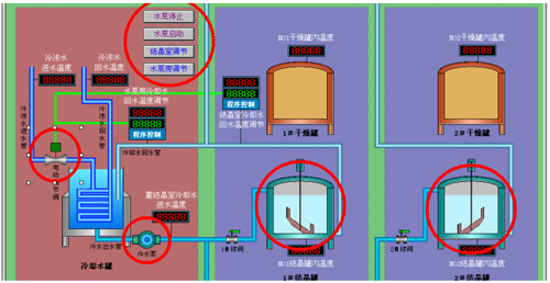上圖是某結(jié)晶罐的結(jié)晶控制系統(tǒng),在該系統(tǒng)中(紅色框部分)使用了一臺(tái)AI-301ME5L5L5L4I5I5用了9個(gè)I/O點(diǎn),4個(gè)輸出點(diǎn)用于手動(dòng)控制水泵的啟停和水溫調(diào)節(jié)的方式,5個(gè)輸入點(diǎn)用于采集顯示攪拌電機(jī)旋轉(zhuǎn)、冷水泵動(dòng)作及調(diào)節(jié)閥的狀態(tài)用動(dòng)畫(huà)來(lái)顯示。