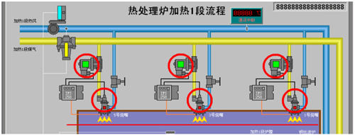 該熱處理加熱監(jiān)控系統(tǒng)使用了4臺(tái)AI-301ME5I5I5I5I5I5共37個(gè)I/O點(diǎn),主要控制和檢測(cè)冷卻風(fēng)機(jī),加熱器,煤氣噴嘴電磁閥,進(jìn)水電磁閥,煤氣濃度報(bào)警器等多個(gè)開(kāi)關(guān)量輸入輸出設(shè)備。