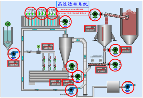 在某高速造粒監(jiān)控系統(tǒng)中使用了2臺(tái)AI-301ME5I5I5I5I5I5S來(lái)采集顯示12個(gè)開(kāi)關(guān)量輸入點(diǎn),主要是各種風(fēng)機(jī)和電磁閥的狀態(tài)。