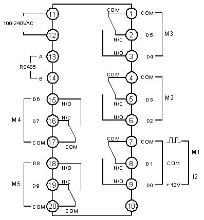 AI-301M有6個(gè)模塊插座,你可以按照不同功能選擇模塊實(shí)現(xiàn)對(duì)開(kāi)關(guān)量信號(hào)輸入輸出的功能。其中COMM(RS485)專(zhuān)用于安裝通訊模塊與計(jì)算機(jī)通訊;其他M1、M2、M3、M4、M5都可以安裝2路開(kāi)關(guān)量輸入或1/2路繼電器輸出模塊,其中M1還可以安裝I2頻率輸入模塊。
